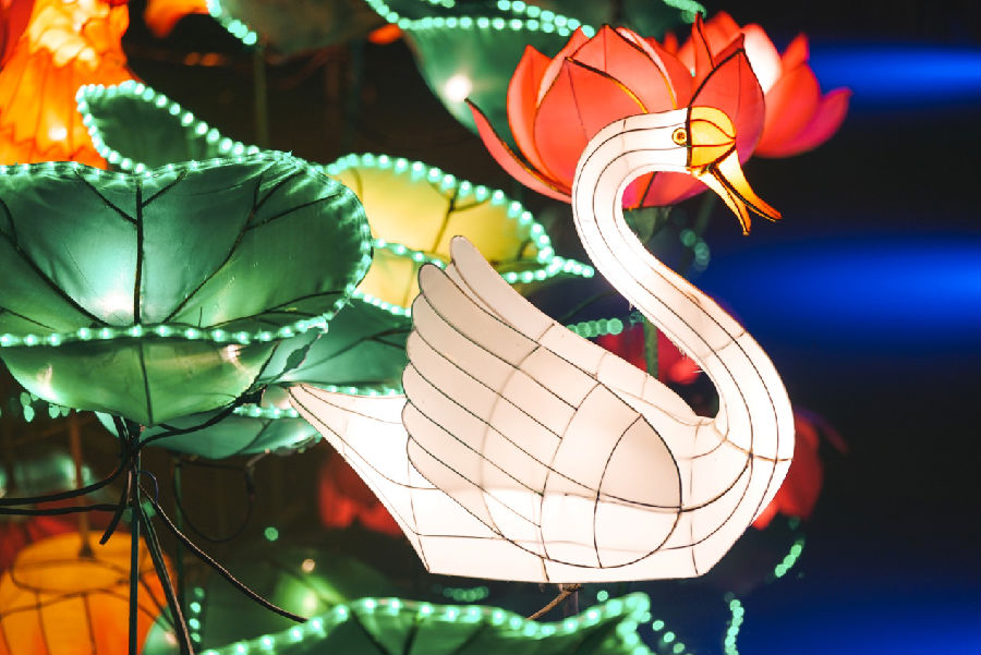 另外两个主景灯“鱼跃龙门”、“哪吒闹海”也十分抢眼,主体造型分别是一“山”、一“海”,极具中国写意山水画的水墨配色和造型线条,整体大气精巧,色彩搭配协调。观景灯中最吸引眼球的就是“星河梦影”了,灯组名称取自元代诗人唐温如的诗句“醉后不知天在水,满船清梦压星河”,一百多米长的紫藤长廊上挂满了数百个各式装饰花灯,走进廊里满天“星光”,就像走进一个流光溢彩的梦。