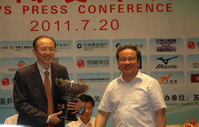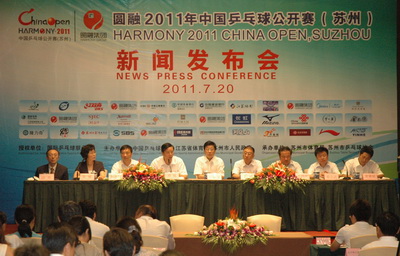 圆融2011年中国乒乓球公开赛(苏州)新闻发布会于7月20日下午在苏州举行,国家体育总局乒乓球羽毛球运动管理中心副主任刘于斌,江苏省体育局副局长周旭,苏州市副市长王鸿声,苏州市市委常委、宣传部部长徐国强等领导出席发布会。圆融集团副总裁沙勇作为冠名赞助商代表与赛事组委会签约,并接受了苏州市副市长王鸿声颁发的纪念杯。