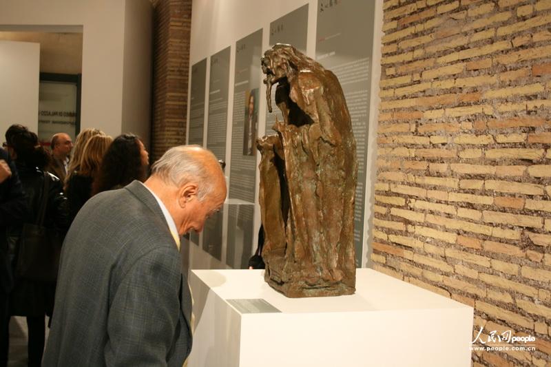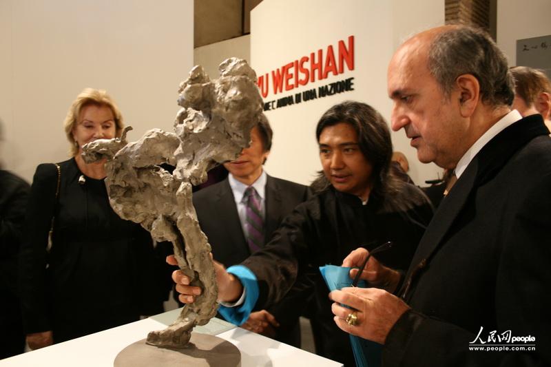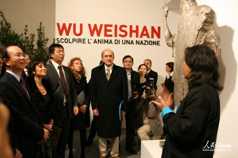 吴为山为出席开幕式的贵宾介绍其作品,左一为中国驻意大利大使丁伟。