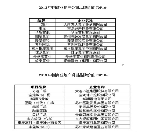 【圆融简讯】圆融三度蝉联中国商业地产公司品牌价值TOP10