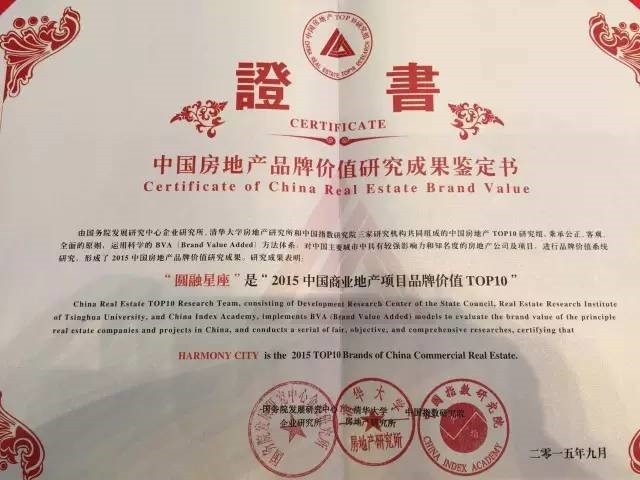2015中国房地产品牌价值研究成果发布会上,新建元控股旗下圆融集团自2011以来第五次荣膺“中国商业地产公司品牌价值TOP10”称号,品牌价值高达人民币贰拾伍亿柒仟捌佰万元(¥2,578,000,000.00)其开发的圆融星座项目首次荣获“2015中国商业地产项目品牌价值TOP10”称号。